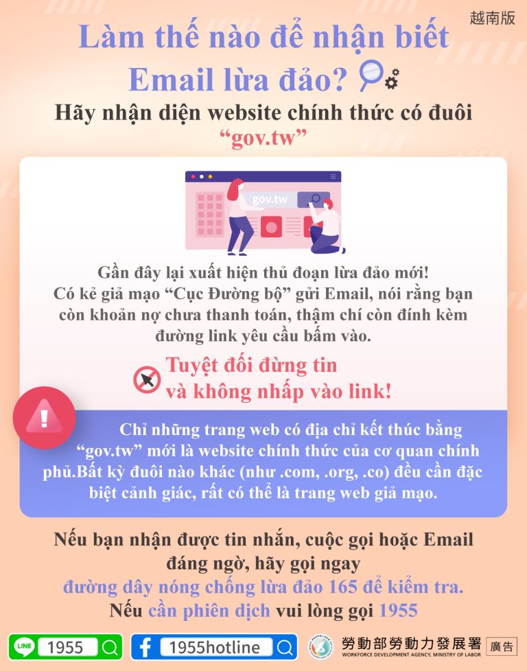 Chỉ những trang web có địa chỉ kết thúc bằng “gov.tw” mới là website chính thức của cơ quan chính phủ.Bất kỳ đuôi nào khác (như .com, .org, .co) đều cần đặc biệt cảnh giác, rất có thể là trang web giả mạo.