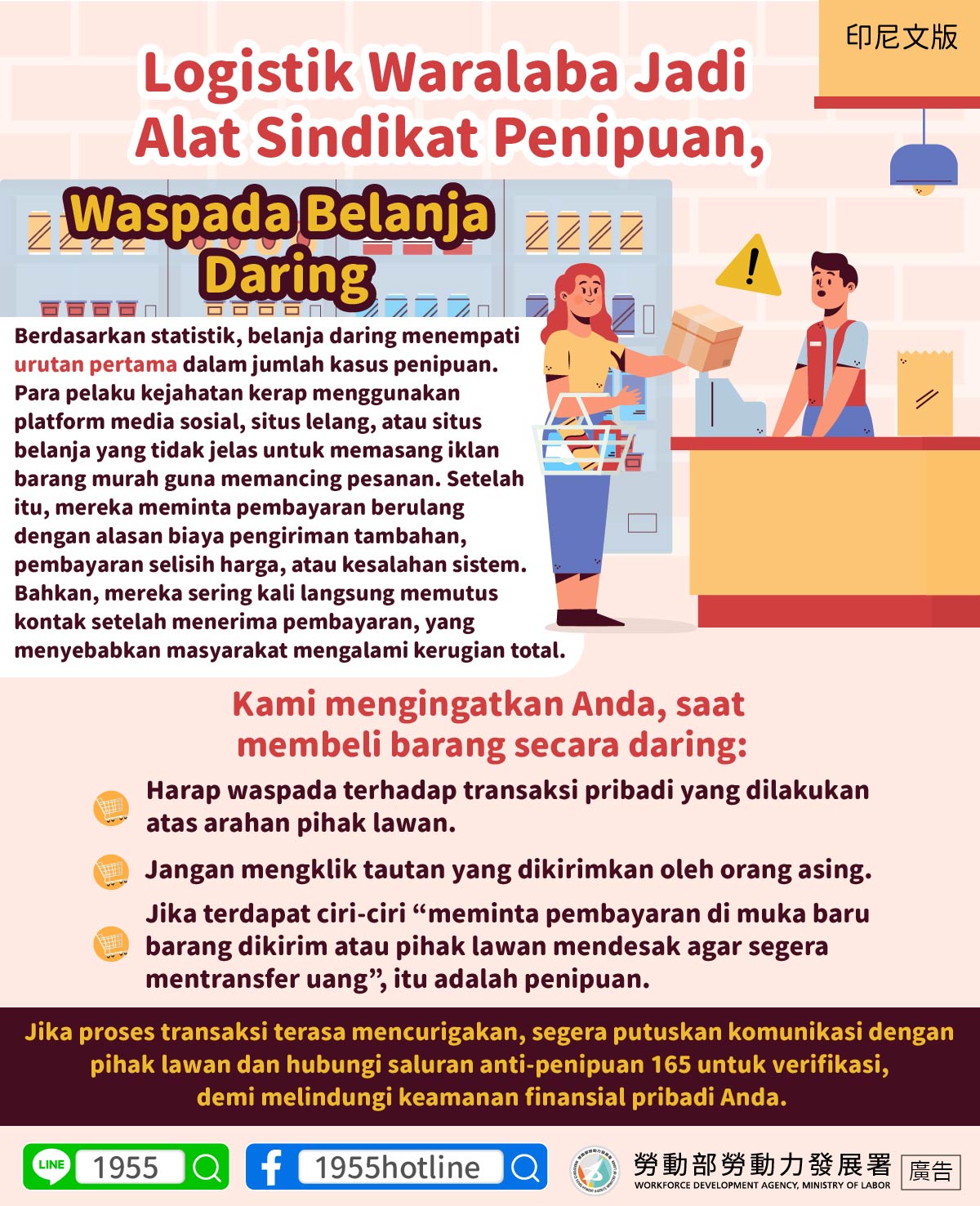 (FWA 2026/01/12)Berdasarkan statistik, belanja daring menempati urutan pertama dalam jumlah kasus penipuan. Para pelaku kejahatan kerap menggunakan platform media sosial, situs lelang, atau situs belanja yang tidak jelas untuk memasang iklan barang murah guna memancing pesanan. Setelah itu, mereka meminta pembayaran berulang dengan alasan biaya pengiriman tambahan, pembayaran selisih harga, atau kesalahan sistem. Bahkan, mereka sering kali langsung memutus kontak setelah menerima pembayaran, yang menyebabkan masyarakat mengalami kerugian total.