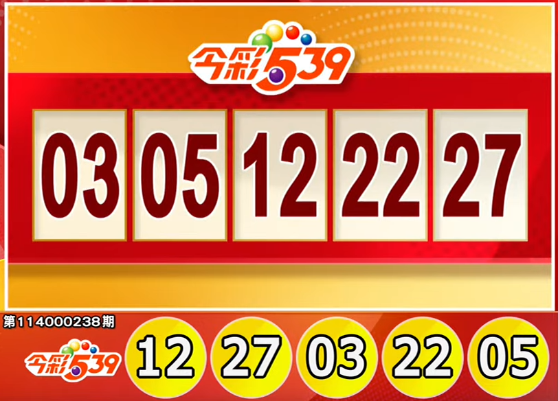 (FWA 2025/10/1) Nomor pemenang untuk Lotre 539 edisi 114000238 adalah 03, 05, 12, 22, 27. Hadiah pertama (cocok kelima nomor) adalah NT$8 juta. Pengundian Lotre 539 diadakan setiap hari Senin hingga Sabtu pukul 20:30. (Nomor pemenang yang sebenarnya tunduk pada pengumuman resmi dari Lotre Taiwan.)