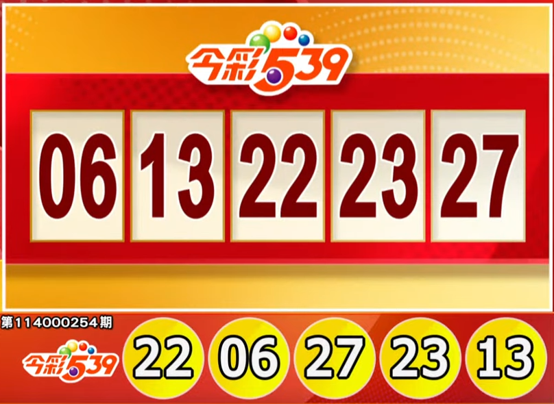 (FWA 2025/10/20) Nomor pemenang untuk Lotre 539 edisi 114000254 adalah 06, 13, 22, 23, 27. Hadiah pertama (cocok kelima nomor) adalah NT$8 juta. Pengundian Lotre 539 diadakan setiap hari Senin hingga Sabtu pukul 20:30. (Nomor pemenang yang sebenarnya tunduk pada pengumuman resmi dari Lotre Taiwan.)