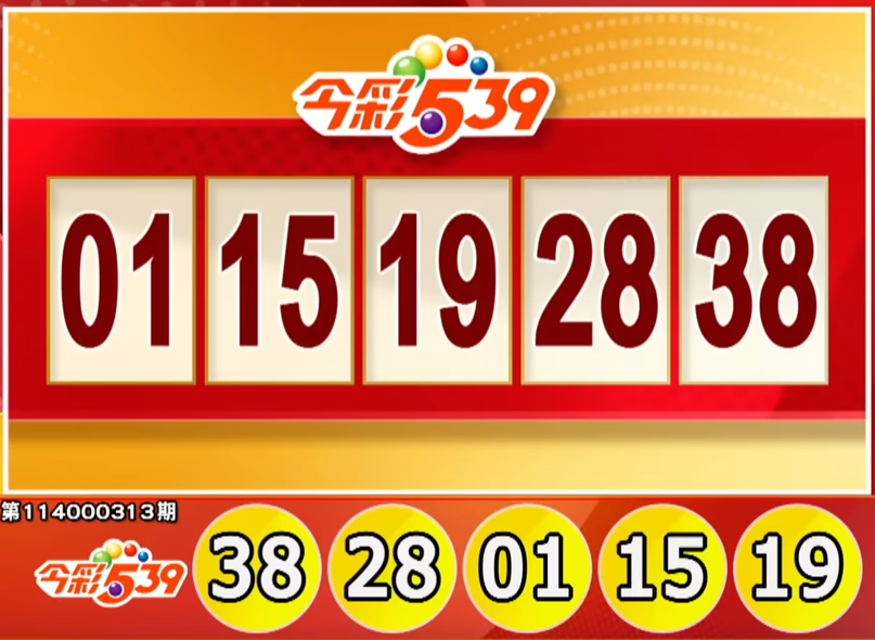 (FWA 2025/12/27) Nomor pemenang untuk Lotre 539 edisi 114000313 adalah 01, 15, 19, 28, 38. Hadiah pertama (cocok kelima nomor) adalah NT$8 juta. Pengundian Lotre 539 diadakan setiap hari Senin hingga Sabtu pukul 20:30. (Nomor pemenang yang sebenarnya tunduk pada pengumuman resmi dari Lotre Taiwan.)