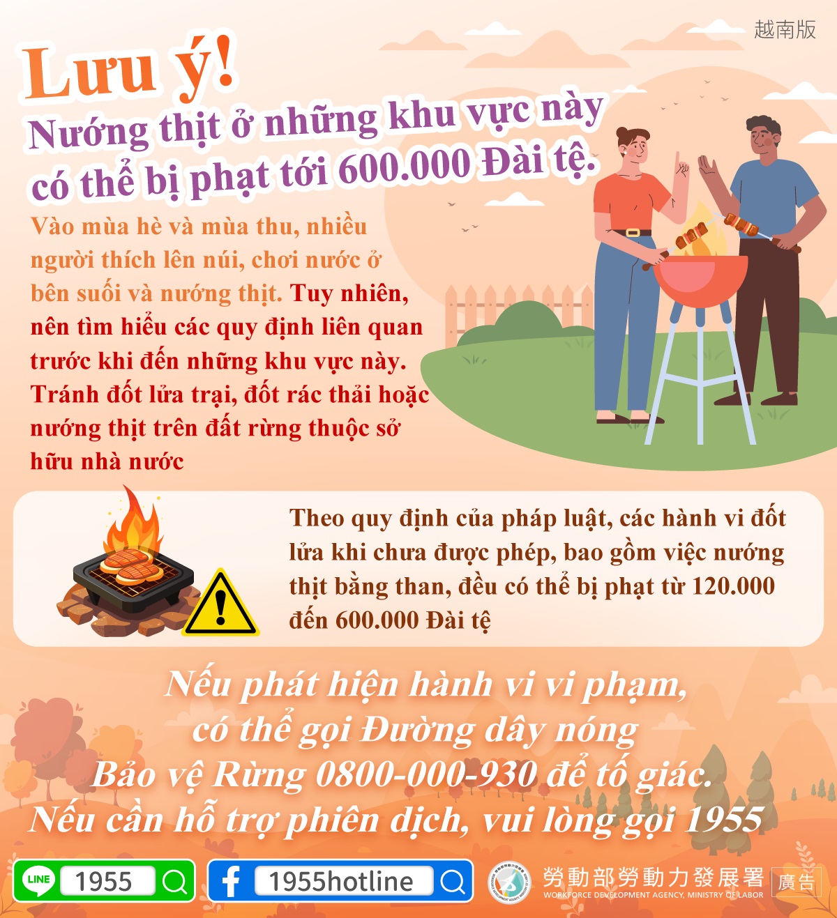 Nếu phát hiện hành vi vi phạm, có thể gọi Đường dây nóng Bảo vệ Rừng 0800-000-930 để tố giác. Nếu cần hỗ trợ phiên dịch, vui lòng gọi 1955