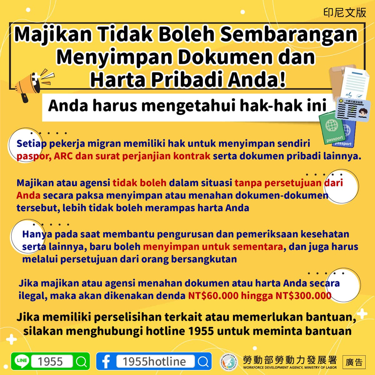 •Jika majikan atau agensi menahan dokumen atau harta Anda secara ilegal, maka akan dikenakan denda NT$60.000 hingga NT$300.000