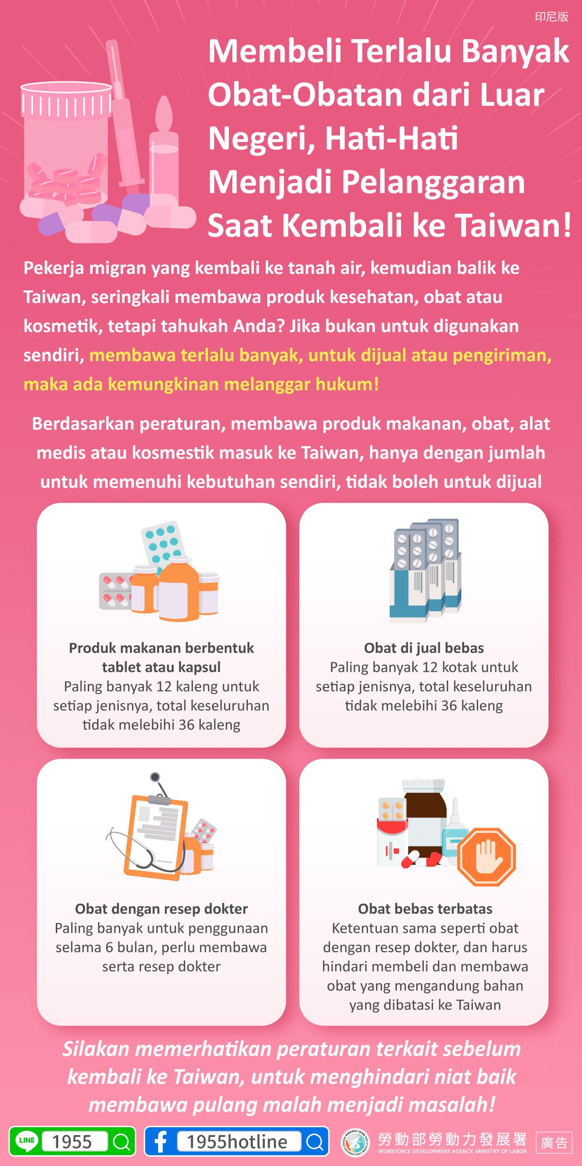 Pekerja migran yang kembali ke tanah air, kemudian balik ke Taiwan, seringkali membawa produk kesehatan, obat atau kosmetik, tetapi tahukah Anda? Jika bukan untuk digunakan sendiri, membawa terlalu banyak, untuk dijual atau pengiriman, maka ada kemungkinan melanggar hukum!