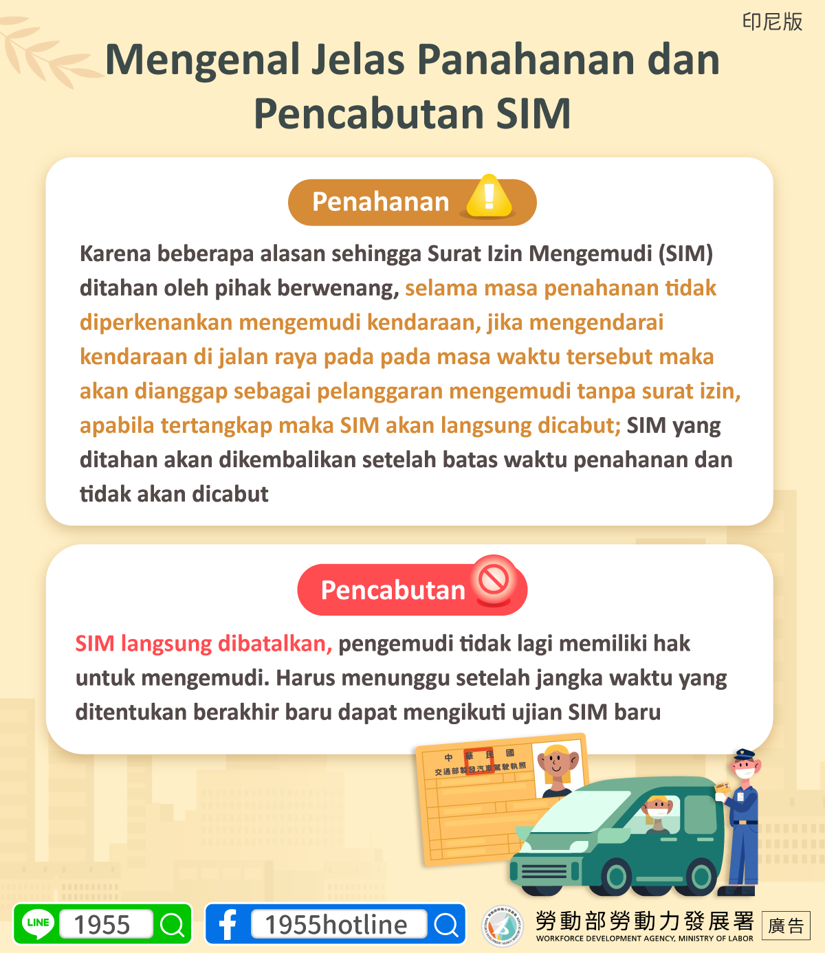 (FWA 2026/01/29)Penahanan – Karena beberapa alasan sehingga Surat Izin Mengemudi (SIM) ditahan oleh pihak berwenang, selama masa penahanan tidak diperkenankan mengemudi kendaraan, jika mengendarai kendaraan di jalan raya pada pada masa waktu tersebut maka akan dianggap sebagai pelanggaran mengemudi tanpa surat izin, apabila tertangkap maka SIM akan langsung dicabut; SIM yang ditahan akan dikembalikan setelah batas waktu penahanan dan tidak akan dicabut