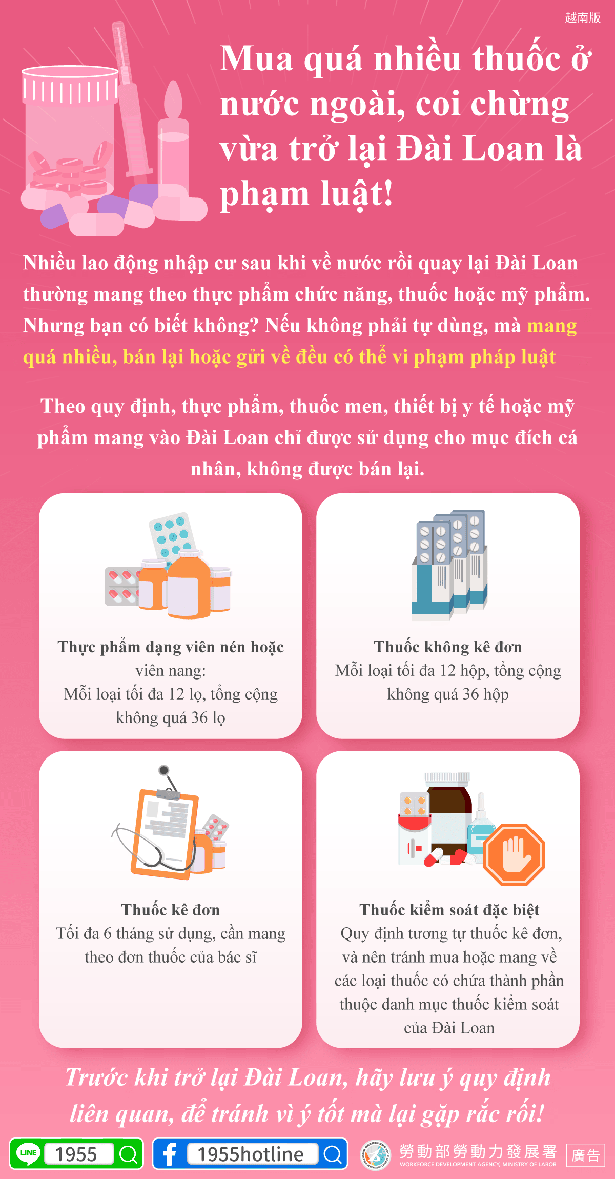 Nhiều lao động nhập cư sau khi về nước rồi quay lại Đài Loan thường mang theo thực phẩm chức năng, thuốc hoặc mỹ phẩm. Nhưng bạn có biết không? Nếu không phải tự dùng, mà mang quá nhiều, bán lại hoặc gửi về đều có thể vi phạm pháp luật