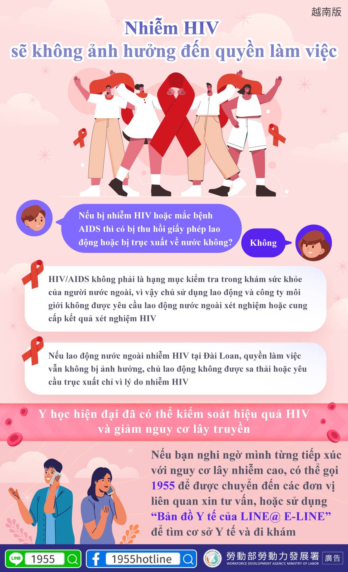 Nếu lao động nước ngoài nhiễm HIV tại Đài Loan, quyền làm việc vẫn không bị ảnh hưởng, chủ lao động không được sa thải hoặc yêu cầu trục xuất chỉ vì lý do nhiễm HIV