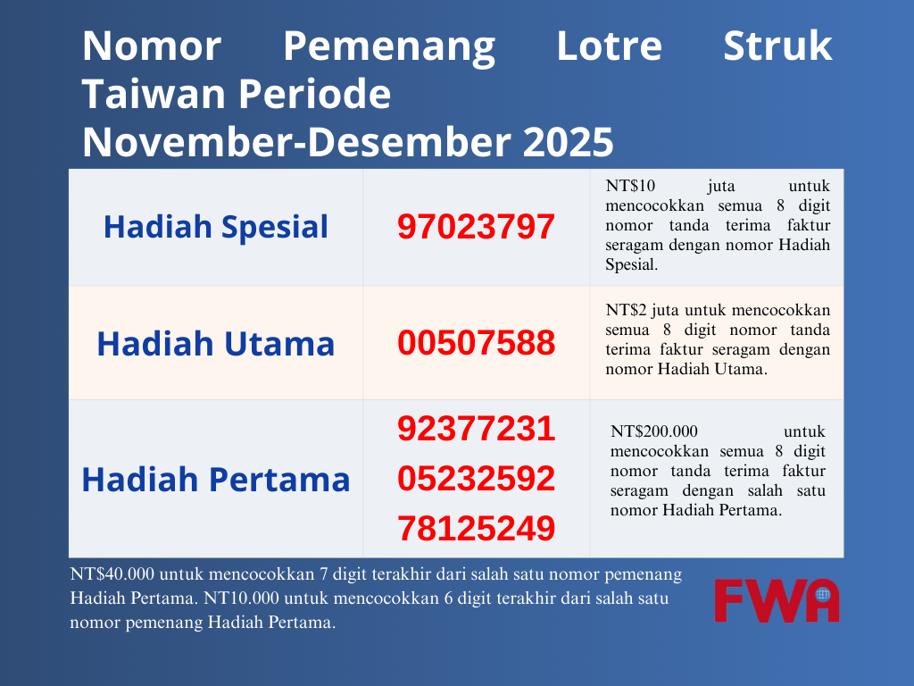 (FWA 2026/1/26)Nomor Pemenang Lotre Struk Taiwan Periode November-Desember Diumumkan. Satu set nomor pemenang masing-masing diundi untuk Hadiah Spesial dan Hadiah Utama, dan tiga set nomor pemenang diundi untuk Hadiah Pertama hingga Hadiah Keenam. Selain itu, 30 set hadiah senilai NT$1 juta, 16.000 set hadiah senilai NT$2.000, 100.000 set hadiah senilai NT$800, dan 3,15 juta set hadiah senilai NT$500 juga diundi untuk Penghargaan Eksklusif Faktur Cloud.