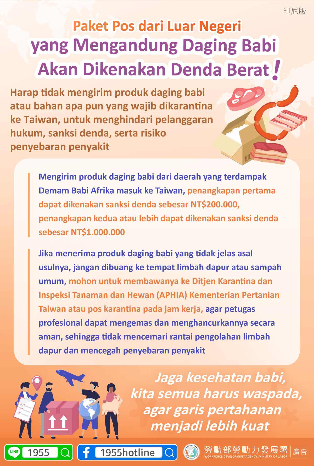 (FWA 2026/02/03)Harap tidak mengirim produk daging babi atau bahan apa pun yang wajib dikarantina ke Taiwan, untuk menghindari pelanggaran hukum, sanksi denda, serta risiko penyebaran penyakit
