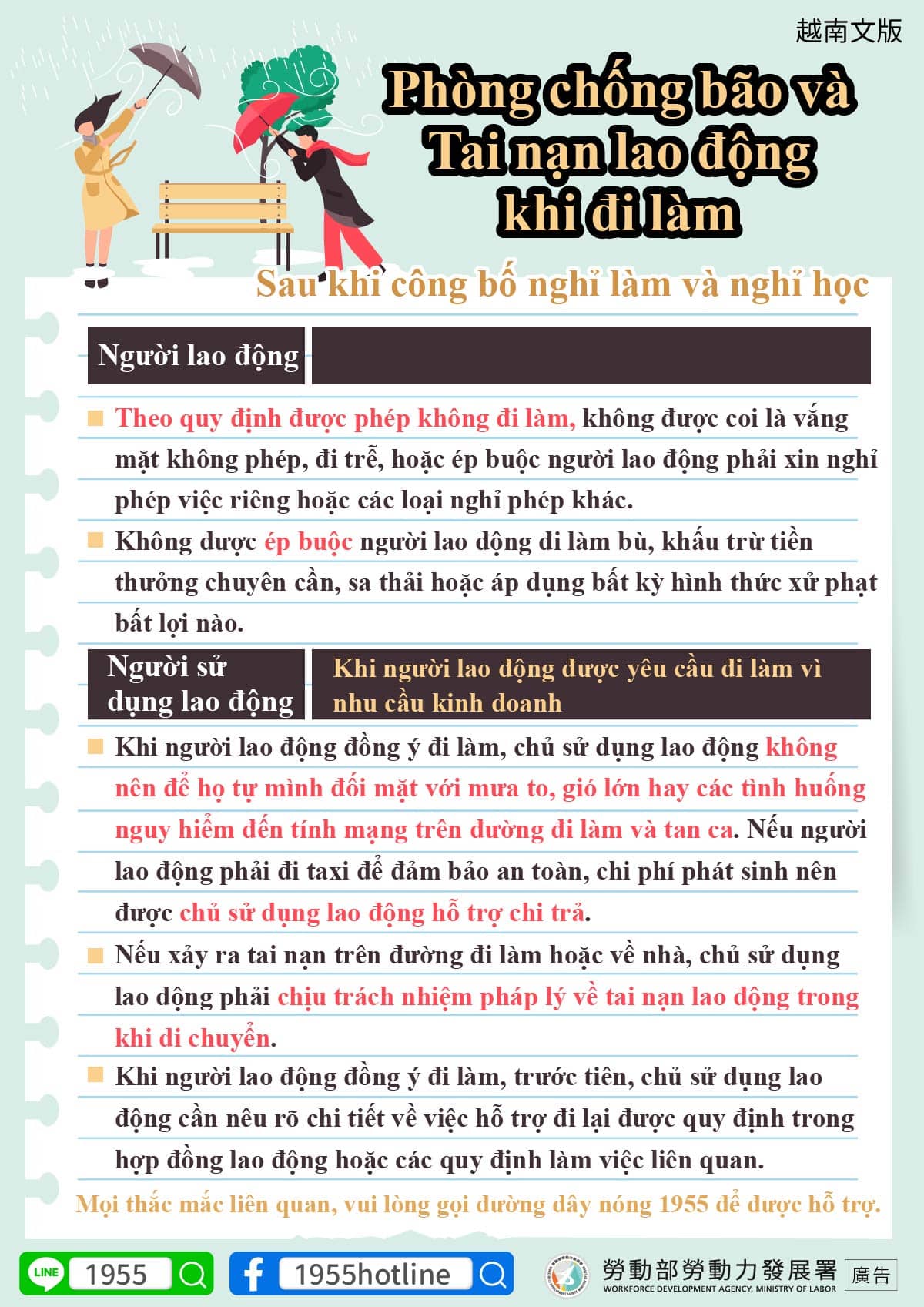 •Khi người lao động đồng ý đi làm, chủ sử dụng lao động không nên để họ tự mình đối mặt với mưa to, gió lớn hay các tình huống nguy hiểm đến tính mạng trên đường đi làm và tan ca. Nếu người lao động phải đi taxi để đảm bảo an toàn, chi phí phát sinh nên được chủ sử dụng lao động hỗ trợ chi trả.