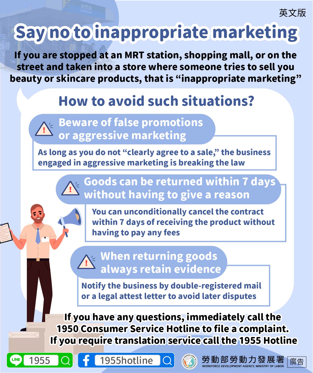 有問題可立即撥打 1950 消費者服務專線申訴,如有通譯需求請撥打1955