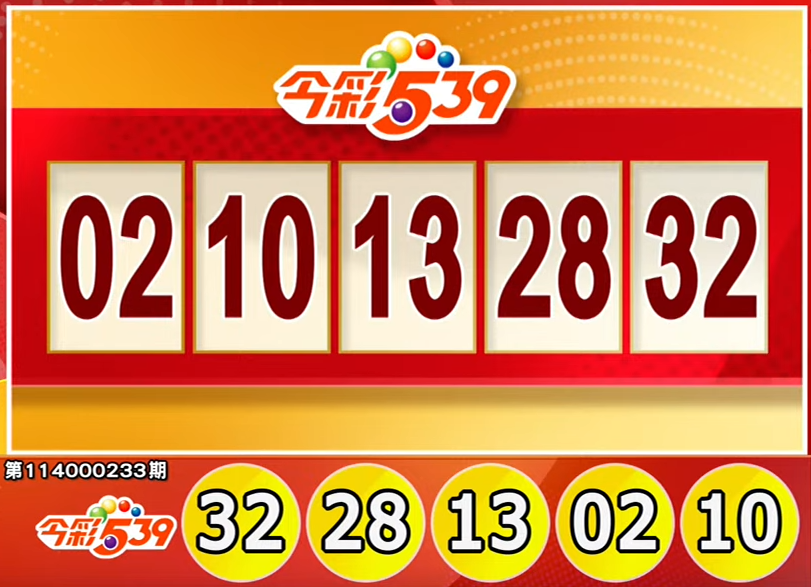 (FWA 2025/09/25)The winning numbers for the 114000233th issue of Daily Cash(Jin Cai 539) 02,10,13,28,32. The first prize (matching all 5 numbers) is NT$8 million. Jin Cai 539 drawings are held every Monday to Saturday at 8:30 PM. (The actual winning numbers are subject to the official announcement by Taiwan Lottery.)