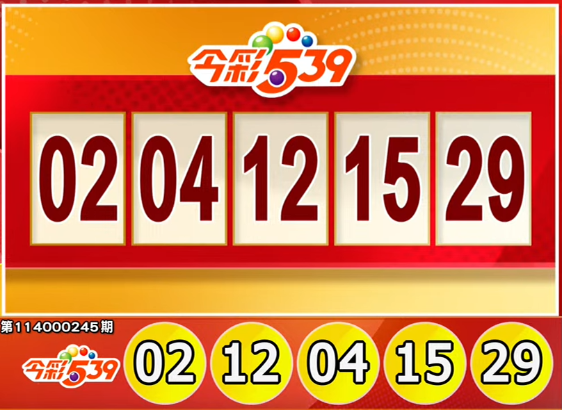(FWA 2025/10/9)The winning numbers for the 114000245th draw of lottery539 are 02, 04, 12, 15, 29. The first prize (matching all 5 numbers) is NT$8 million. lottery539 drawings are held every Monday to Saturday at 8:30 PM. (The actual winning numbers are subject to the official announcement by Taiwan Lottery.)