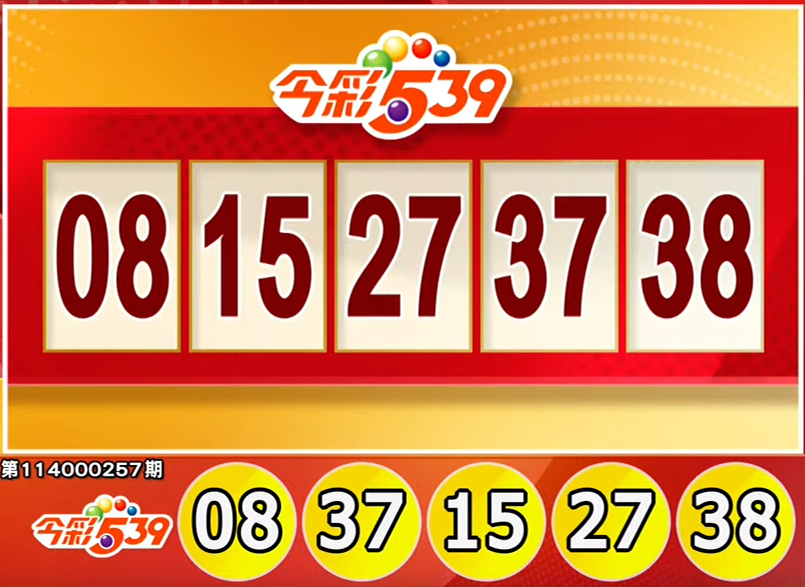 (FWA 2025/10/23)The winning numbers for the 114000257th draw of lottery539 are 08, 15, 27, 37, 38. The first prize (matching all 5 numbers) is NT$8 million. lottery539 drawings are held every Monday to Saturday at 8:30 PM. (The actual winning numbers are subject to the official announcement by Taiwan Lottery.)