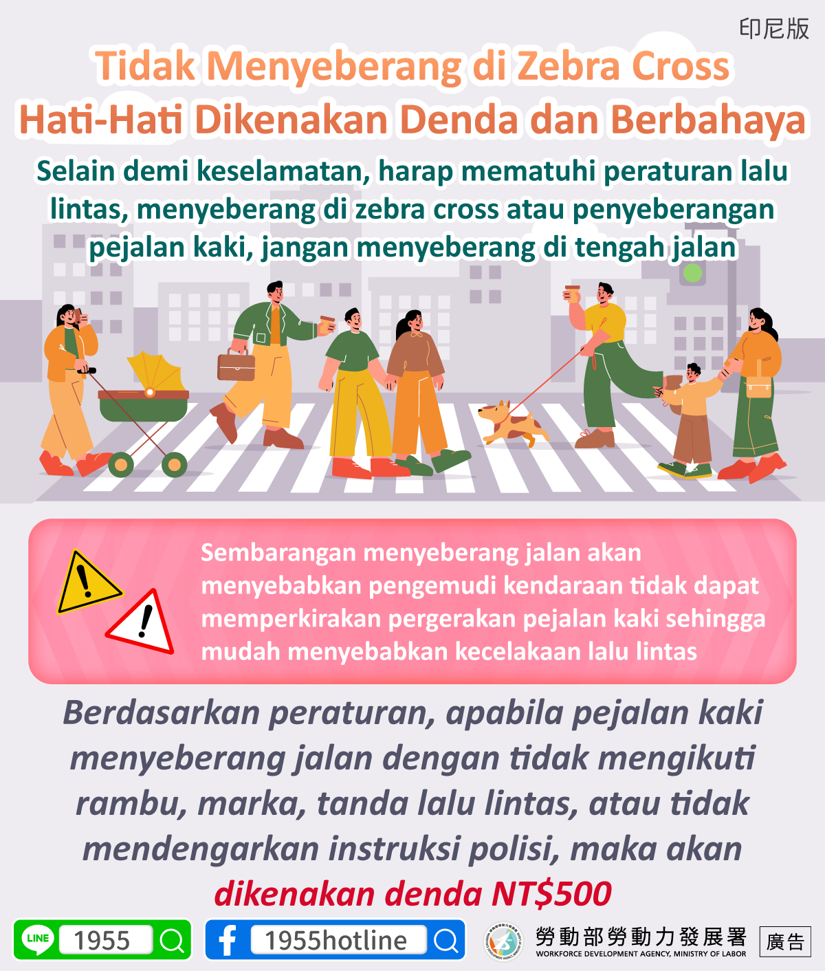 Berdasarkan peraturan, apabila pejalan kaki menyeberang jalan dengan tidak mengikuti rambu, marka, tanda lalu lintas, atau tidak mendengarkan instruksi polisi, maka akan dikenakan denda NT$500