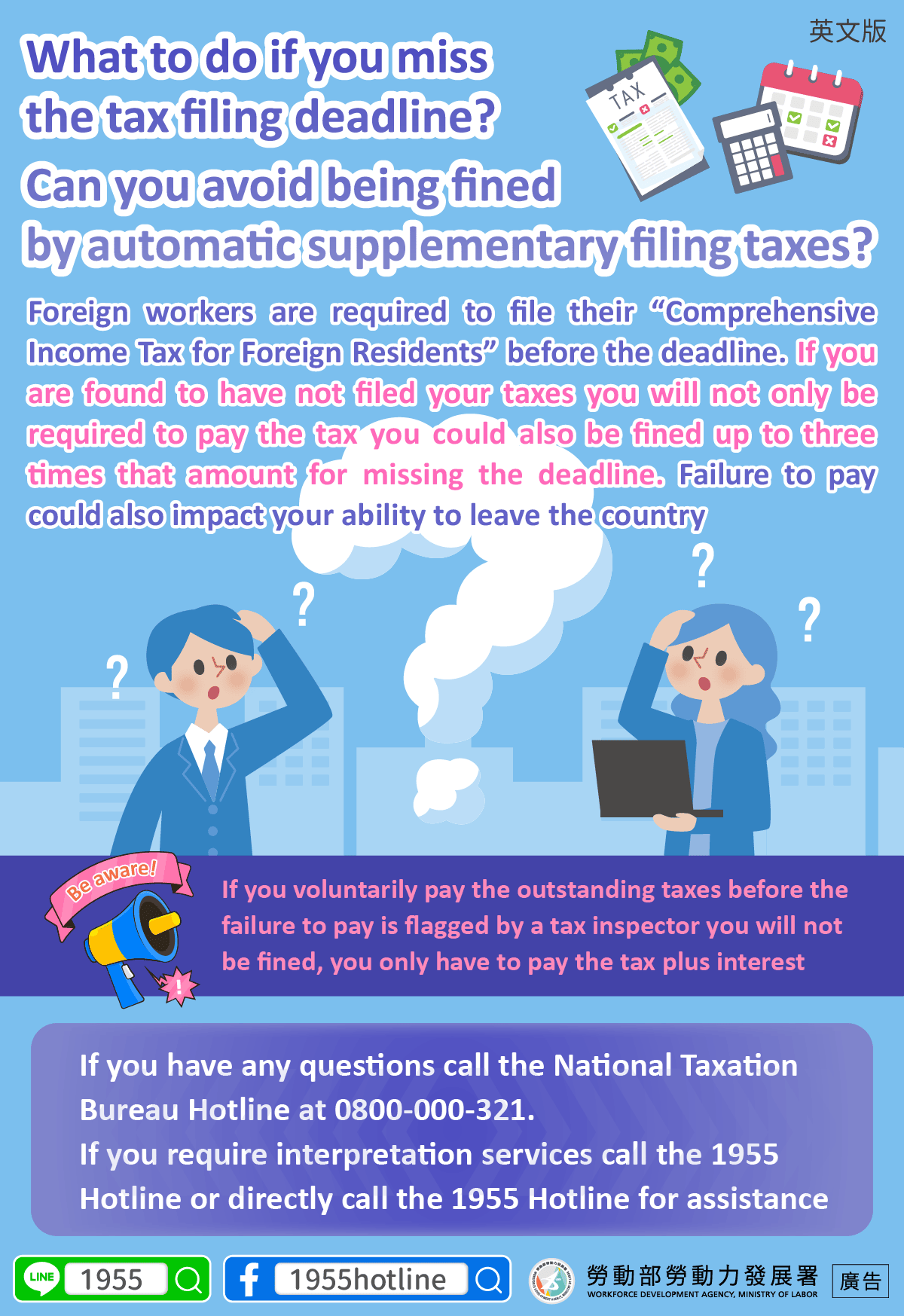 移工若符合規定要申報「外僑綜合所得稅」,記得一定要在期限內完成。若被發現沒申報,除了要補繳稅金外,還可能被罰最多3倍的稅金,甚至會影響出國手續,無法順利離境