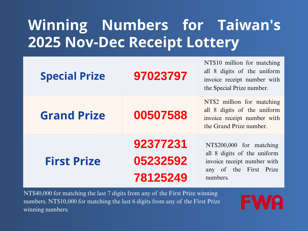 (FWA 2026/1/26)The winning numbers for the November-December 2025 Taiwan receipt lottery announced. One winning number each was drawn for the Special Prize and the Grand Prize, and three sets of winning numbers were drawn for the First Prize through Sixth Prize. Additionally, 30 sets of NT$1 million prizes, 16,000 sets of NT$2,000 prizes, 100,000 sets of NT$800 prizes, and 3.15 million sets of NT$500 prizes were drawn for the Cloud Invoice Exclusive Awards.