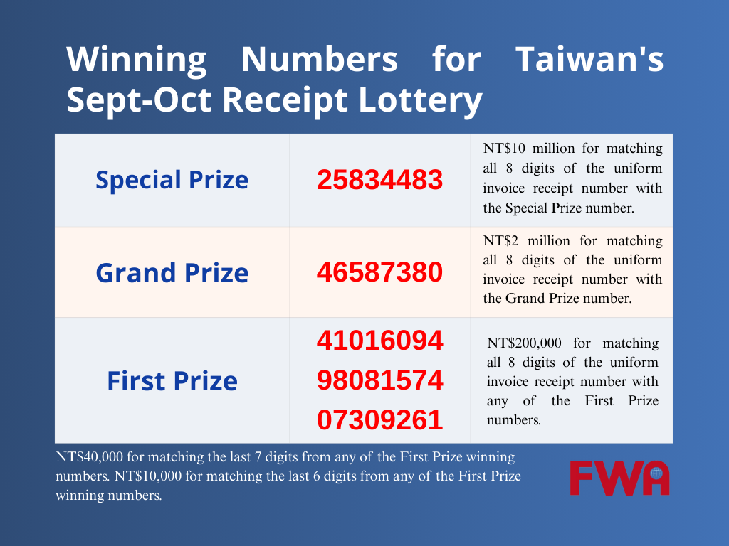 (FWA 2025/11/25) The Ministry of Finance (MOF) today revealed the winning numbers for the September-October(9-10) 2025 receipt lottery, offering millions in cash prizes. The highly anticipated winning number for the NT$10 million Special Prize is 25834483. The NT$2 million Grand Prize will go to the holder of the receipt with the number 46587380. Three First Prizes of NT$200,000 each were also drawn, with the winning numbers being: