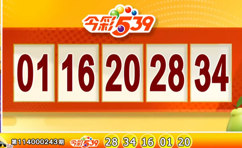 (FWA 2025/10/7) Các số trúng thưởng của Xổ số 539 kỳ 114000243 là 01, 16, 20, 28, 34. Giải nhất (trùng cả 5 số) trị giá 8 triệu Đài tệ. Lễ quay số Xổ số 539 được tổ chức vào mỗi thứ Hai đến thứ Bảy lúc 20:30. (Các số trúng thưởng thực tế phải tuân theo thông báo chính thức của Xổ số Đài Loan.)