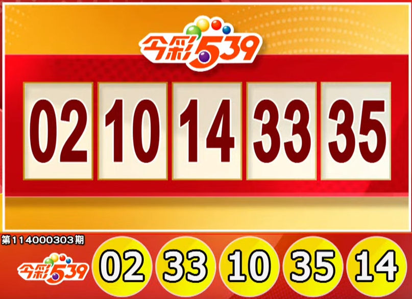 (FWA 2025/12/16) Các số trúng thưởng của Xổ số 539 kỳ 114000303 là 02, 10, 14, 33, 35. Giải nhất (trùng cả 5 số) trị giá 8 triệu Đài tệ. Lễ quay số Xổ số 539 được tổ chức vào mỗi thứ Hai đến thứ Bảy lúc 20:30. (Các số trúng thưởng thực tế phải tuân theo thông báo chính thức của Xổ số Đài Loan.)