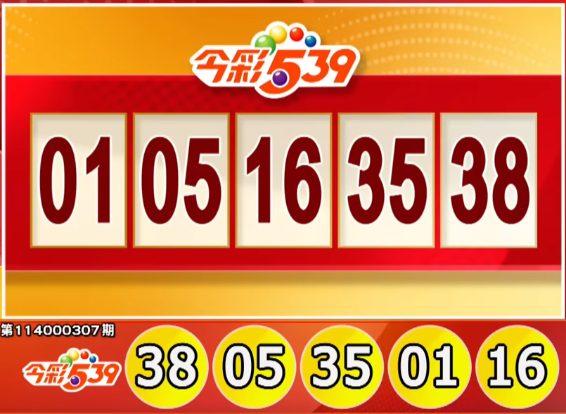 (FWA 2025/12/20) Các số trúng thưởng của Xổ số 539 kỳ 114000307 là 01, 05, 16, 35, 38. Giải nhất (trùng cả 5 số) trị giá 8 triệu Đài tệ. Lễ quay số Xổ số 539 được tổ chức vào mỗi thứ Hai đến thứ Bảy lúc 20:30. (Các số trúng thưởng thực tế phải tuân theo thông báo chính thức của Xổ số Đài Loan.)