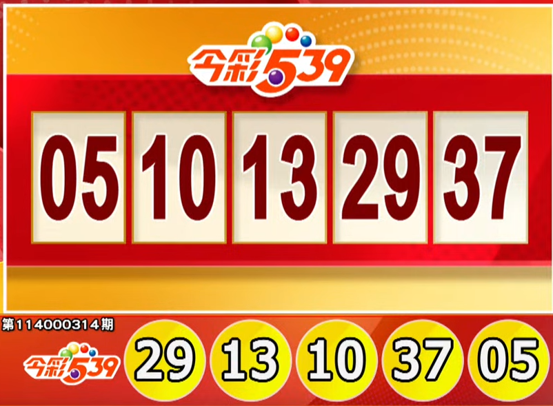 (FWA 2025/12/29) Các số trúng thưởng của Xổ số 539 kỳ 114000314 là 05, 10, 13, 29, 37. Giải nhất (trùng cả 5 số) trị giá 8 triệu Đài tệ. Lễ quay số Xổ số 539 được tổ chức vào mỗi thứ Hai đến thứ Bảy lúc 20:30. (Các số trúng thưởng thực tế phải tuân theo thông báo chính thức của Xổ số Đài Loan.)
