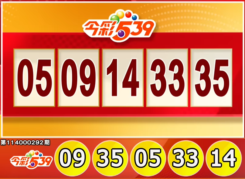 (FWA 2025/12/3) Các số trúng thưởng của Xổ số 539 kỳ 114000292 là 05, 09, 14, 33, 35. Giải nhất (trùng cả 5 số) trị giá 8 triệu Đài tệ. Lễ quay số Xổ số 539 được tổ chức vào mỗi thứ Hai đến thứ Bảy lúc 20:30. (Các số trúng thưởng thực tế phải tuân theo thông báo chính thức của Xổ số Đài Loan.)